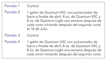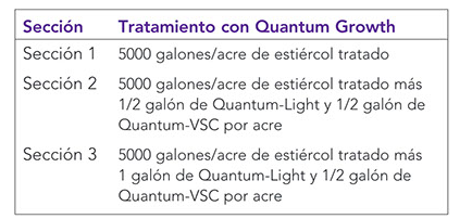 Se establecieron tres secciones de crecimiento, todas con insumos diferentes. Todas las tres secciones se trataron con 5000 galones por acre de estiércol tratado. La Sección 1 fue el control. A las Secciones 2 y 3 se les agregó distintas cantidades de Quantum Growth.