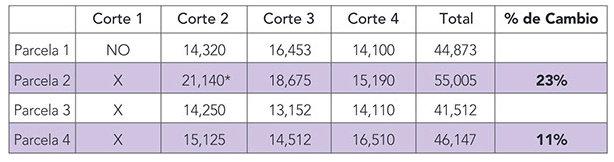 La tabla de abajo muestra los ingresos adicionales que se generaroncon las parcelas que utilizaron Quantum Growth. Los montos recolectados permiten una pérdida de peso del 15% en agua.s.