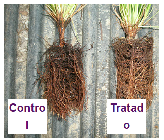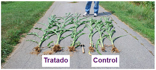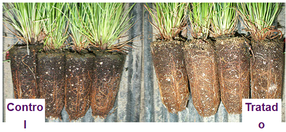 Nótese el tamaño de la masa radicular, circunferencia del tallo yaltura de las plantas tratadas. También, la planta tratada hacomenzado a sacar panoja mientras que el control sigue creciendo.