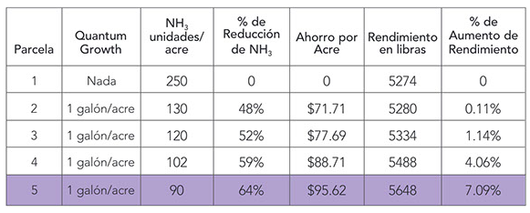 El diseño de la prueba en campo incluyó cinco parcelas de 10 acres cada una. El control utilizó el protocolo estándar de fertilizante. Cada una de las otras 4 parcelas utilizó 1 galón/acre de Quantum Growth y distintas cantidades de fertili-zante de nitrógeno para determinar los parámetros de aplicación óptimos para la siguiente temporada. Las reducciones en la aplicación del anhídrido de amoníaco de un 48% a 64% se compararon con el control que utilizó el estándar de 250unidades/acre. (Una unidad de fertilizante equivale a 1.2195 libras al costo de $0.59 por unidad).