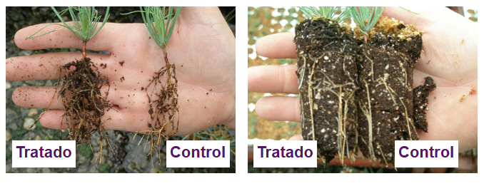 Después de 30 días, el vigor de la aguja y masa radicular aumentaron significativamente. El pilón tratado mostró una masa radicular más densa y unsistema radicular con propagación uniforme a lo largo del pilón. Esto demuestrala capacidad de los microorganismos para distribuir el agua uniformementeen el suelo, mejorando así la absorción y retención. Esto es especialmenteimportante mientras los árboles crecen en el bosque únicamente conprecipitación o humedad natural. El uso de Quantum Growth aumentó ladisponibilidad de nutrientes y energía para la planta, potenciando el crecimiento de la raíz y producción de fruto. Esto da como resultado plantas más sanas yfuertes que dependen cada vez menos de riego complementario, fertilizante y plaguicida