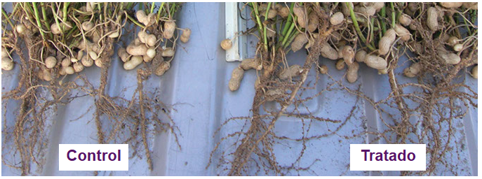 El tamaño de los caca-huates tratados es más grande que los del con-trol. También se nota un incremento en la masa de radicular y nodulación más densa.