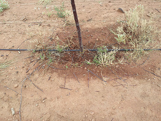 Entre abril y junio, el huerto recibió 2 galones por acre de varios productos Quantum Growth. Este aro de humedad es el remanente de una breve llovizna. Pareciera estar irrigado, cuando de hecho lleva 12 días sin irrigación antes de la foto.