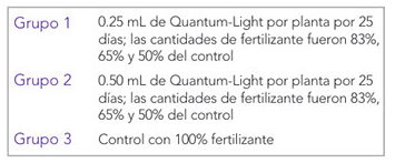 El ExperimentoEl experimento consistió de 3 diferentes grupos de plantas con 400 plantas por grupo. A los grupos 1 y 2se les dio diferentes cantidades de Quantum-Light y fertilizante. El grupo 3 solo recibió fertilizante. Quantum-Light se aplicó a las plantas usando una bomba de mochila. Al finalizar el experimento se tomaron las medidas para determinar el crecimiento de cada tratamiento.