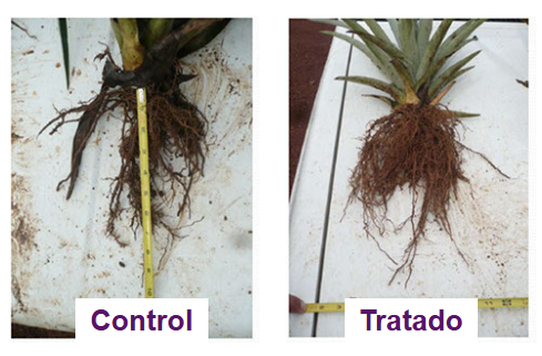 La piña tratada sigue teniendo raíces más grandes.