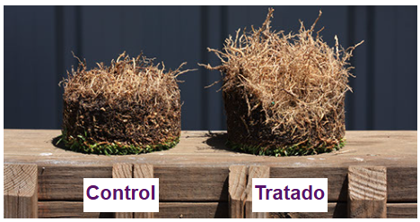 Los céspedes tratados con Quantum Growth tiene raíces mucho más grandes y túrgidas. La muestra del suelo tratadocon Quantum Growth demuestra una mejor capacidad para retener agua que la muestra de control debido a la masa de bacterias fotosintéticas y raíces más grandes.