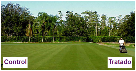 Nótese el verde más oscuro del césped en la seccióntratada con Quantum Growth.