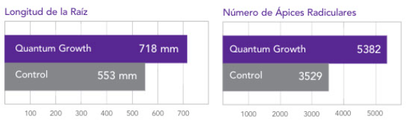 Los resultados obtenidos en un estudiorealizado por la Universidad de Floridademostraron que la aplicación de Quantum Growth resultó en un aumento del 30% enel largo de las raíces y un incremento del53% de los ápices de las raíces.