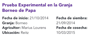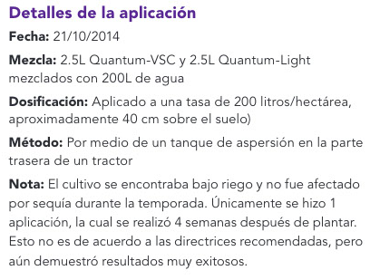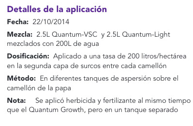 Cada granja se visitó 5 veces durante el experimento. El producto se aplicó de acuerdo a las instrucciones de Ecological Laboratories, Inc. (ELI). En la primera visita a la granja, los representantes de ELI explicaron los protocolos de aplicación y los beneficios de Quantum Growth. En la segunda visita, la siembra de papa se acompañó con la aplicación de un galón de Quantum-VSC por hectárea en lasparcelas tratadas. Treinta días después se aplicó Quantum-VSC en el suelo y luego de treinta días se roció Quantum-Light en las hojas. Las plantas se cosecharon 30 días después de la última aplicación.