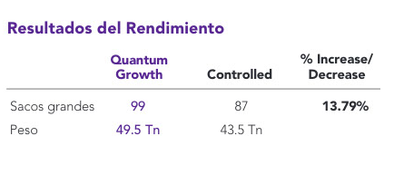 El equipo de apoyo técnico de Ecological Labs desarrolló un protocolo para inocular con Quantum Growth una sección de la finca como prueba experimental. En tan solo 16 días después de la siembra se evidenció un crecimiento más rápido y saludable. Durante la cosecha, los cultivos tratados mostraron un aumento del 30% en surendimiento versus el control, de 8,800 a 11,424 libras promedio por acre. Lasplantas que recibieron tratamiento se mostraron significativamente más sanas a lolargo de la prueba experimental. Los microorganismos en Quantum Growth trabajan de forma natural para brindarles alimento y energía a las plantas, permitiéndoles enfocarse en su crecimiento radicular y producción de fruto. Esto da como resultado plantas más saludables y sustanciosas con rendimientos elevados y una disminuciónen la dependencia de riego adicional, fertilizantes y plaguicidas.