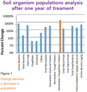 Analysis of the lower soil life forms found increases in a majority of the populations, some significant (Fig 1). Additionally, analysis of the bacterial populations showed an increase in the number of species present (Fig 2). This increase in the diversity of the bacterial community directly correlates to an increase in the functionality of that community (i.e. nutrient transfer, nitrogen fixation, mineral solubilization, etc.) A healthy and diverse microbial soil community provides ideal conditions for optimizing plant performance. Futhermore, there was an 82% increase in yield of the treated grove compared to its yield prior to treatment.