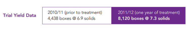 A trial was conducted to see the benefits of Quantum Growth on citrus trees. Quantum Growth was applied as a root drench at 1 gallon per acre every three months in a 20 acre Valencia grove. The block contained a mix of mature and 3-4 year old trees. It was the only biological input throughout the trial. Soil and tissue samples were collected pre-treatment (July 2011) and after one year of treatment (July 2012).